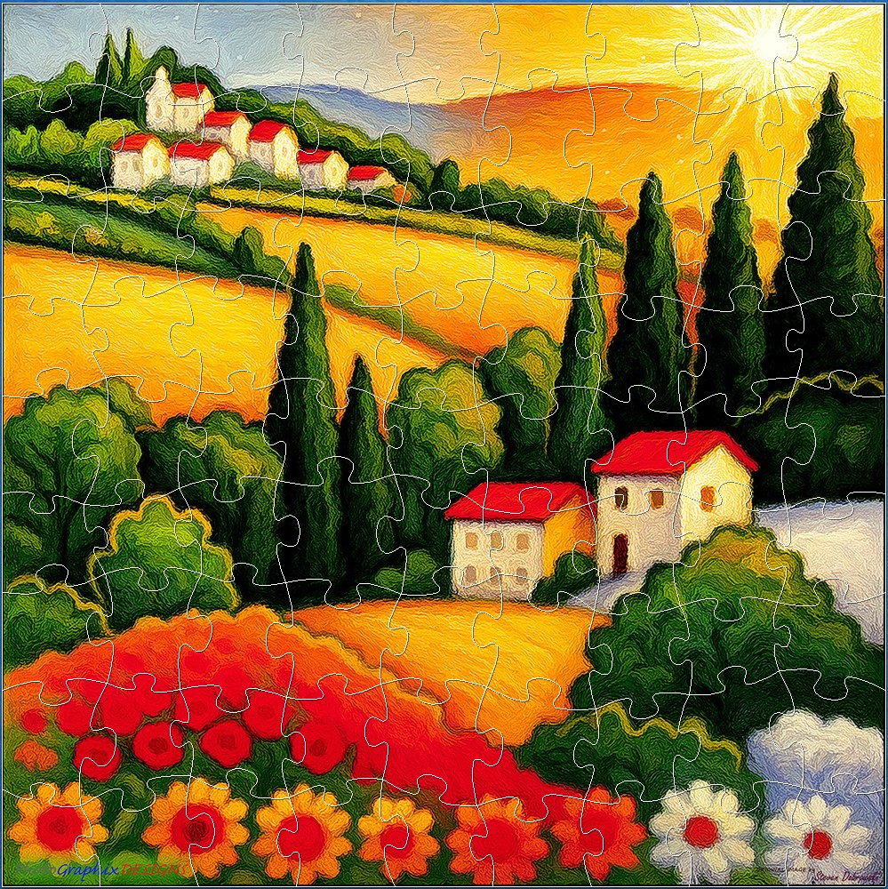 TUSCANY Step into a sun-drenched dream where colour dances across rolling hills and golden fields glow beneath a painted sky. This vibrant landscape whispers of timeless afternoons, warm earth, quiet joy, and sheer delight. It invites you to pause, breathe, and lose yourself in a world where every shade sings and serenity blooms. Let your imagination wander where the light lingers.
